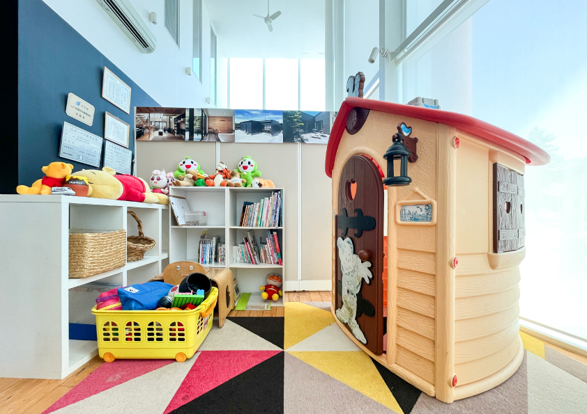 通りがかりの赤ちゃん連れの方もオムツの取り換えや授乳用の湯水が必要な時は、お気軽に寄ってください。又、子どもがいるから、落ち着いて考えることができないという理由で、家づくりをためらっていらっしゃる方!家をつくる際の打合せは長く時間のかかるもの。そこで、店内はお子様連れのお客様にも長時間落ち着いて打合せできる空間づくりを心掛けています。面倒見のいい女性スタッフがいますので、お気軽にお越しください。